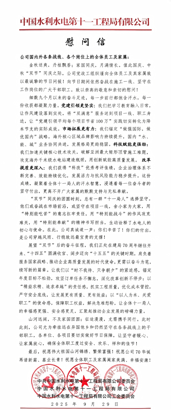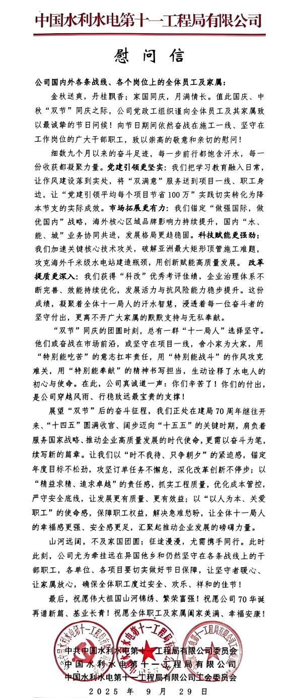 公司向全体员工及家属发慰问信祝贺“双节”