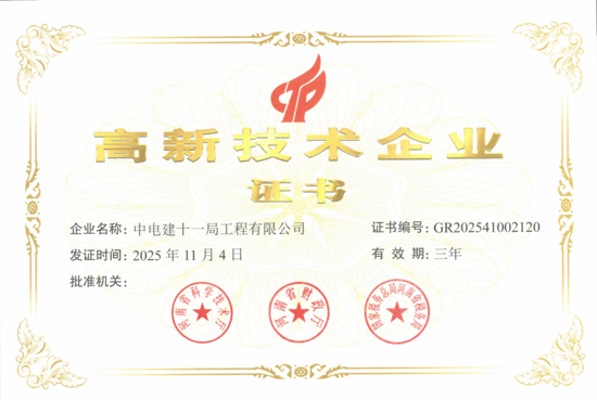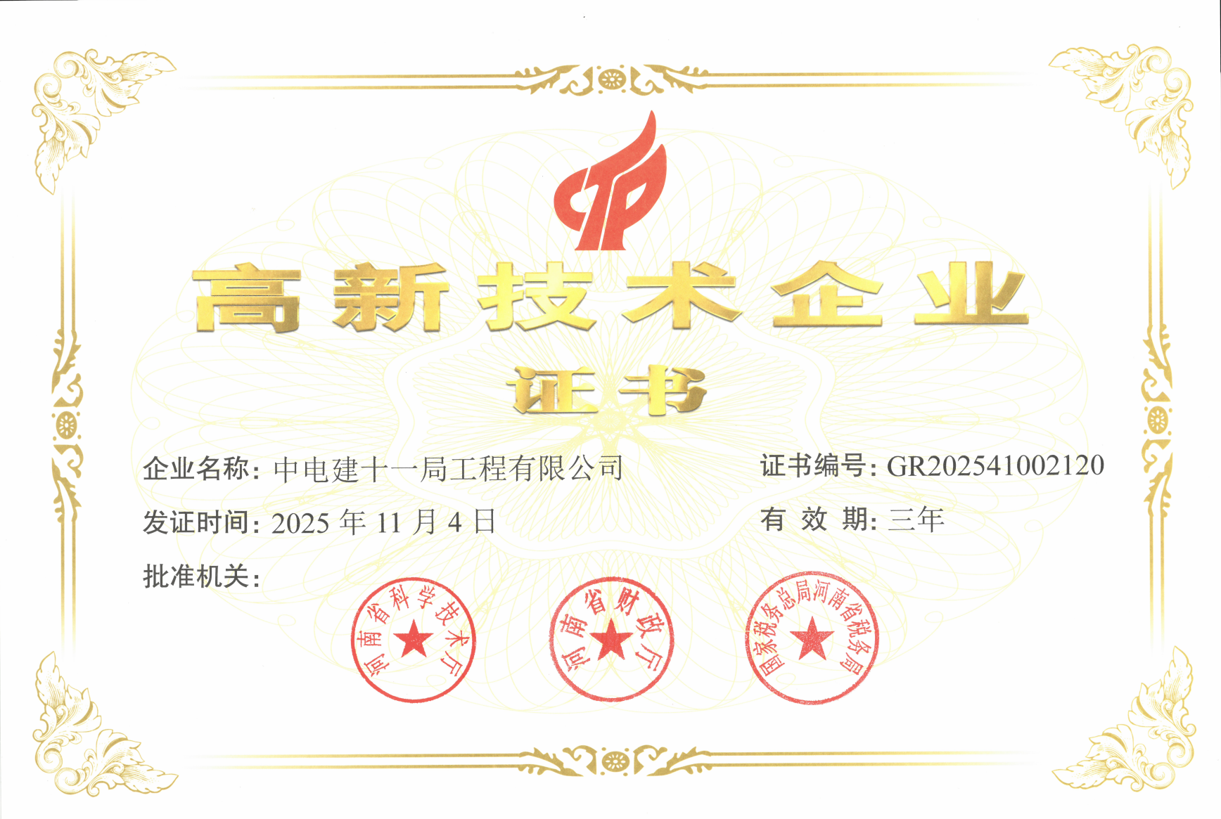 近日,中电建十一局工程有限公司顺利通过高新技术企业再认定,成功获得由河南省科学技术厅、河南省财政厅、国家税务总局河南省税务局联合颁发的高新技术企业证书。