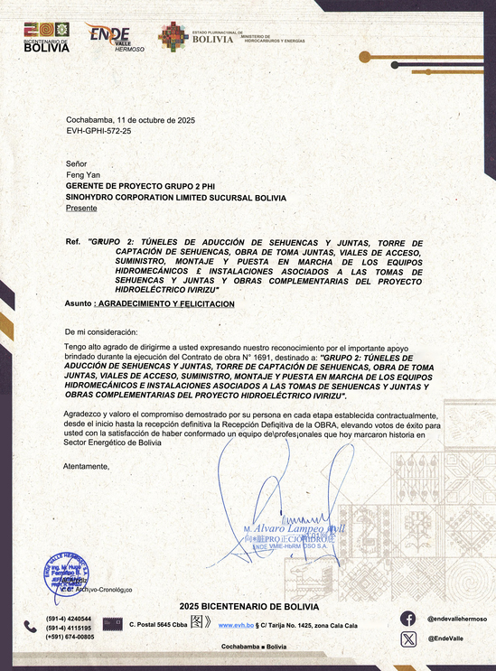 近日,公司玻利维亚伊比利苏水电站Ⅱ标项目部收到项目业主——美丽谷公司(M.Alvaro Lampeo Aye)签发的正式表扬信,对Ⅱ标段项目团队的卓越表现予以高度肯定。 表扬信中指出,在项目经理冯岩的带领下,项目团队克服诸多挑战,圆满完成了合同规定的全部建设任务。业主方特别强调,中国电建团队自项目启动至最终交付,始终秉持高度的敬业精神与专业的合作态度,其卓越贡献为伊比利苏水电站的整体成功奠定了坚实基础。 “我们为您组建的专业团队感到由衷的钦佩,这支团队如今已在玻利维亚能源领域书写了历史。”业主在信中的这一评价,既是对中国电建专业技术与履约能力的肯定,也是对中玻团队精诚协作、共克难关精神的高度认可,标志着中国电建品牌在玻利维亚市场树立起良好信誉。 作为玻利维亚国家能源战略的关键项目,伊比利苏水电站的顺利推进对保障当地能源安全、推动清洁能源发展具有重要意义。未来,中国电建将继续打造更多惠及当地的精品工程,为深化中玻两国在基础设施与清洁能源领域的合作注入强劲动力,推动新时代友好关系持续向好发展。 表扬信 |