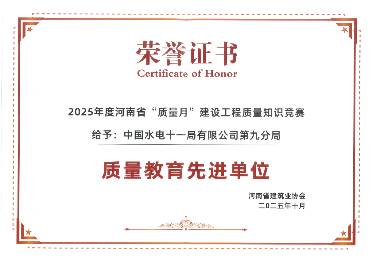 近日,河南省建筑业协会公布2025年河南省“质量月”建设工程质量知识竞赛结果,九分局凭借扎实的质量教育基础、精心组织的参赛工作及优异的综合表现,一举斩获“优秀组织单位”称号,并被授予“质量教育先进单位”荣誉称号。 此次荣获“优秀组织单位”与“质量教育先进单位”双荣誉,既是河南省建筑业协会对九分局质量教育工作的高度认可,更是对分局深耕质量管控、培育质量人才成效的充分肯定。作为建筑业领域的重要参与者,九分局始终将“质量第一”作为企业发展的生命线,此次获奖不仅是对过往工作的总结,更是未来持续提升质量水平的新起点。 九分局将以此次获奖为契机,进一步弘扬工匠精神,深化质量教育成果,将竞赛中积累的经验转化为日常质量管控的实效,不断夯实工程质量根基,为推动河南省建筑业高质量发展、助力质量强国建设贡献更多“十一局力量”。 获奖证书 优秀组织单位 |