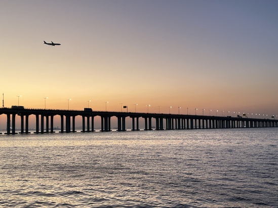 星未醒,灯先醒,夜浮礁。长鲸脊上,车影如矢破空翱。莫叹夕阳易逝,自有钢躯擎月,潮汐掌中调。留取熔金魄,永照去来涛。