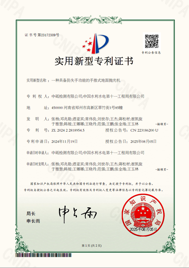 近日,中砥检测有限公司自主研发的“一种具备防失手功能的手推式地面抛光机”成功获得国家知识产权局颁发的《实用新型专利证书》。这一成果标志着公司在建筑操控设备安全领域实现重要技术突破。 在日常建筑地面抛光作业中,操作人员常因长时间工作或突发情况导致设备脱手。传统抛光机在失去手动控制后仍会持续运转,极易造成设备失控,对操作人员、周边环境及地面本身带来严重安全隐患。本专利设计了一种防失手保护装置,通过机械联动实现“人机分离即停”,有效杜绝设备失控现象。 该项专利不仅体现了中砥检测有限公司在技术创新方面的努力,更彰显了公司对安全生产的高度重视。该装置结构简单、响应灵敏、可靠性强,可广泛应用于各类建筑地面施工场景,显著提升作业安全性,降低事故风险。 |