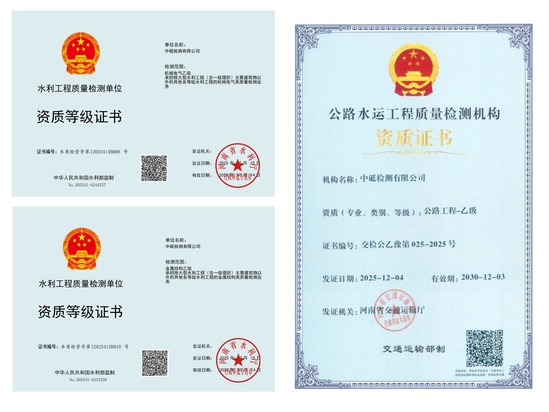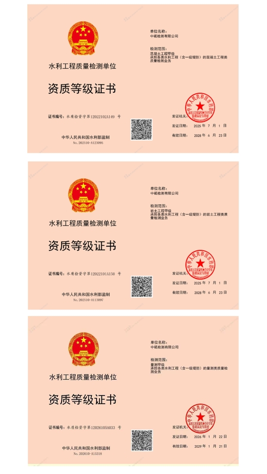 近日,中砥检测有限公司(以下简称“中砥公司”)成功斩获水利工程质量检测量测甲级资质,标志着中砥公司已具备承担大型水利工程(含一级堤防)安全监测业务的能力。至此,中砥公司成功构建起以“三甲三乙”为核心的专业资质体系,为进一步服务大型水利工程、拓展高端市场奠定了坚实基础。 中砥公司始终坚守“中正无私、砥砺前行、检依法规、测必明确”的质量方针,依托专业的检测团队、先进的试验设备和丰富的实践经验,先后参与多项重大水利工程的质量检测工作,以精准的数据、严谨的态度为工程质量筑牢“安全屏障”,赢得了业主单位和行业各界的广泛赞誉。目前中砥公司已具备水利混凝土工程、岩土工程、量测三项核心甲级资质,金属结构、机械电气、公路工程三项乙级资质,以及建筑材料及构配件、市政工程材料专项资质,并获批国家高新技术企业。 中砥公司将以此次获证为契机,进一步强化技术创新、优化服务流程、提升专业能力,为各类工程提供更优质、更高效、更专业的技术服务,为公司高质量发展贡献力量。 甲级资质 乙级资质 |
