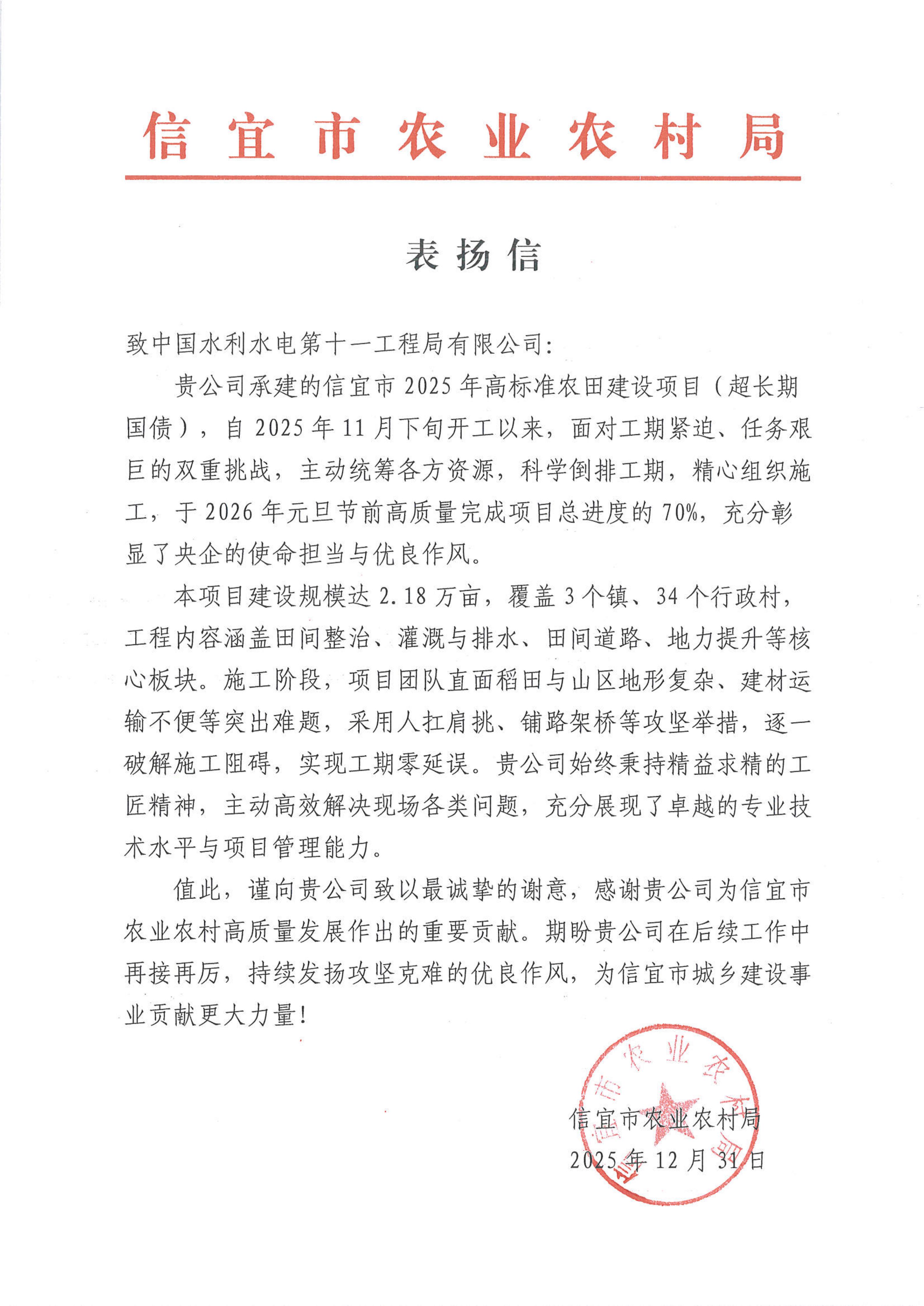 12月31日,信宜市农业农村局、信宜市水利水电工程建设管理中心向我公司发来表扬信,对信宜市2025年高标准农田建设项目、信宜市竹山河等6条河道排水防涝更新改造工程之六迎河和小水河等片区排水防涝更新改造工程EPC项目、信宜市城乡一体供水项目安全、高效、优质完成施工任务表示衷心的感谢和诚挚的问候。 信宜市农业农村局在表扬信中说,信宜市2025年高标准农田建设项目建设规模达2.18万亩,覆盖3个镇、34个行政村,工程内容涵盖田间整治、灌溉与排水、田间道路、地力提升等核心板块。施工阶段,项目团队直面稻田与山区地形复杂、建材运输不便等突出难题,采用人扛肩挑、铺路架桥等攻坚举措,逐一破解施工阻碍,实现工期零延误。贵公司始终秉持精益求精的工匠精神,主动高效解决现场各类问题,充分展现了卓越的专业技术水平与项目管理能力。希望贵公司在后续工作中再接再厉,持续发扬攻坚克难的优良作风,为信宜市城乡建设事业贡献更大力量! 信宜市水利水电工程建设管理中心在表扬信中说,贵公司信宜分公司在施工过程中能够严格按照我方统一协调与安排,勇担重任,投入施工以来,项目部统一思想、统一步调、科学组织、精心部署,严格按照施工技术步骤施工,层层落实安全、环环紧扣质量,加大人员投入,全力以赴做好了各项工作。贵公司表现出来的无私奉献、顽强拼搏的施工风范和一心为业主服务的理念给我单位留下了深刻印象。希望贵公司继续保持优良的施工风范及服务理念,并衷心祝愿我们在今后的工作中能精诚合作,共铸辉煌! 表扬信 |