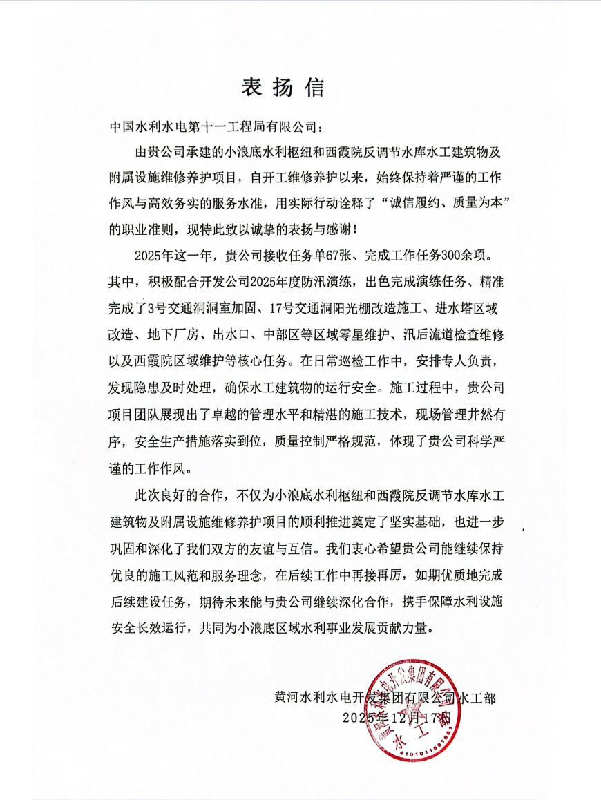 近日,科研设计院小浪底水利枢纽和西霞院反调节水库水工建筑物及附属设施维修养护项目收到业主方发来的表扬信,对公司严谨务实、高效优质的工作作风给予高度认可并致以诚挚感谢。 2025年以来,项目部全力以赴,扎实推进各项工作,全年累计接收任务单67份,完成维修养护任务300余项。团队配合完成年度防汛演练,组织实施3号、17号交通洞加固改造,顺利完成进水塔、地下厂房、出水口等重点区域维护工作,并圆满完成汛后流道检查及西霞院区域维护等关键任务,全方位筑牢工程安全防线。 项目部始终坚持“安全第一、质量为本”,建立健全日常巡检机制,做到隐患早发现、早处理,在施工过程中展现出卓越的管理与技术水平,现场作业规范有序,安全质量管控严格,生动体现了公司诚信履约、精益求精的工作作风。业主单位在表扬信中表示,期待公司再接再厉,持续优质完成后续任务,携手筑牢工程安全屏障。 此次表彰令项目部倍感鼓舞,表示将把这份认可转化为前进动力,以更高标准、更严要求持续推进各项工作,不断提升专业水平,为保障水利工程安全、助力公司高质量发展贡献更多力量。 |