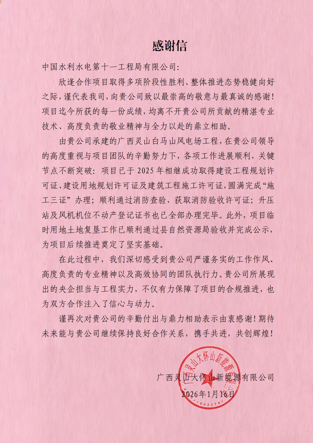 近日,广西灵山大怀山新能源有限公司向公司发来感谢信,对广西白马山风电项目取得多项阶段性胜利、整体推进态势稳健向好,对公司的辛勤付出和鼎力相助表示衷心的感谢。 感谢信中说,由贵公司承建的广西灵山白马山风电场工程,在贵公司领导的高度重视与项目团队的辛勤努力下,各项工作进展顺利,关键节点不断突破:项目已于2025年相继成功取得建设工程规划许可证、建设用地规划许可证及建筑工程施工许可证,圆满完成“施工三证”办理;顺利通过消防查验,获取消防验收许可证;升压站及风机机位不动产登记证书也已全部办理完毕。此外,项目临时用地土地复垦工作已顺利通过县自然资源局验收并完成公示,为项目后续推进奠定了坚实基础。 感谢信中表示,贵公司所展现出的央企担当与工程实力,不仅有力保障了项目的合规推进,也为双方合作注入了信心与动力。期待未来能与贵公司继续保持良好合作关系,携手共进,共创辉煌。 感谢信 |