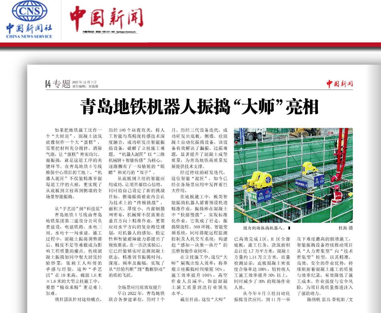 如果把地铁施工比作一个“大厨房”,混凝土浇筑就像制作一个大“蛋糕”,需要把材料充分搅拌、消除气泡,让“蛋糕”密实均匀。而振捣,就是这道工序的关键环节。在青岛地铁5号线维保中心项目的工地上,“机器人泥匠”不仅能精准掌握每道工序的火候,更实现了从底板到立柱再到侧墙的全场景智能振捣。 从“手艺活”到“科技范” 青岛地铁5号线由青岛地铁集团第三建设分公司负责建设,电建铁路、水电三局、水电十一局承建。施工过程中,混凝土振捣调整滞后、精度不足等难题成为影响工程质量的痛点。传统混凝土振捣如同中餐大厨凭经验炒菜,依赖工人师傅的手感与经验。这种“手艺活”在10米高、截面1.6米×1.6米的大型立柱施工中,要想“精益求精”更是难上加难。 项目团队针对这些痛点,历经180个昼夜攻关,将人工智能与高精度传感技术深度融合,成功研发出智能振捣设备,破解了立柱施工难题。“机器人泥匠”以“三维机械臂+智能传感”为核心,逐渐拥有了一双敏锐的“眼睛”和灵巧的“双手”。 从底板到立柱的智能应用成功,让项目部信心倍增,同时给自己设定了新的挑战目标。侧墙振捣被业内公认为技术上的“终极挑战”,面积大、厚度小、内部钢筋网密布,机械臂不仅需要在垂直方向上精准作业,更要应对水平方向的复杂路径规划,对机器人的感知、稳定性和智能避障能力都提出了极致要求。在一次次实验后,它已经能够实时监测混凝土状态,精准调节振捣时间、深度、频率及振幅,实现了从“经验判断”到“数据驱动”的质的飞跃。 全场景应用质效双提升 早自2022年,青岛地铁联合各参建单位,历时7个月、历经三代设备迭代,成功研发出底板、侧墙、柱混凝土自动化振捣设备。该设备有效解决了漏振、过振难题,显著提升了混凝土成型质量,为青岛地铁高质量发展提供技术支撑。 经过持续的研发迭代,这位智能“泥匠”,如今已经在各场景应用中发挥着巨大作用。 在底板施工中,板类智能振捣机器人循着预设轨迹精准作业,振捣棒在混凝土中“快插慢拨”,实现标准化作业。它集成了行走、振捣臂旋转、360环视、智能变频系统,同时搭配远程监测控制及人机交互系统,构建起“感知—决策—执行”的完整智能作业闭环。 在立柱施工中,这位“大师”展现出惊人效率:将单根立柱振捣时间缩短50%,施工效率提升100%,高空作业人员减半,饰面混凝土施工质量到达行业领先水平。 截至目前,这位“大师”已高效完成I区、H区全部底板,施工任务,浇筑面积总计近1.7万平方米,混凝土方量约1.14万立方米。质量检测显示,底板混凝土密实度合格率达100%,较传统人工施工效率提升30%以上,同时减少了30%的现场作业人员。 从今年9月立柱自动化振捣首次应用,到11月一举攻下难度最高的侧墙施工,智能振捣设备持续推动项目从“人力密集型”向“技术密集型”转型,以其精准、高效、安全的作业优势,持续刷新着混凝土施工的质量与效率纪录,有效降低了施工成本、作业强度与安全风险,为项目高质量推进注入了强劲动力。 报道截图 中国新闻报道链接:http://epaper.chinanews.com/ 人民网报道链接:https://app.people.cn/h5/detail/normal/6592442638812160 |