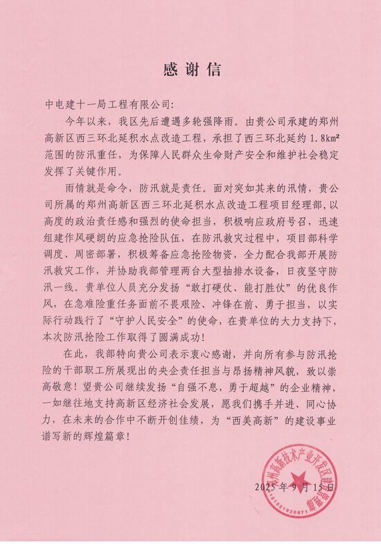 近日,郑州高新区建设管理部发来感谢信,对我公司郑州高新区西三环北延积水点改造工程项目部在防汛抢险工作中的突出表现表示衷心感谢,肯定了项目在民生保障领域中展现出的责任与担当。 郑州高新区西三环北延积水点改造工程是保障区域防汛安全的关键工程,今年8月份以来,高新区遭遇多轮强降雨,防汛形势严峻。面对紧急情况,项目部迅速响应政府号召,以高度的政治责任感组建起一支作风过硬、反应迅速的应急抢险队伍。在防汛救灾过程中,项目部坚持科学调度、周密部署,提前筹备应急抢险物资,积极配合高新区相关部门开展工作,并主动协助管理两台大型抽排水设备。全体抢险人员日夜坚守一线、连续奋战,在急难险重任务面前不畏艰险、冲锋在前,为防汛抢险工作提供了关键支持,以实际行动践行“守护人民安全”的使命。 工程公司将继续深耕郑州民生工程领域,以更坚定的担当、更扎实的行动支持地方经济社会发展,与各方携手为“西美高新”建设贡献更大力量。 感谢信 |
